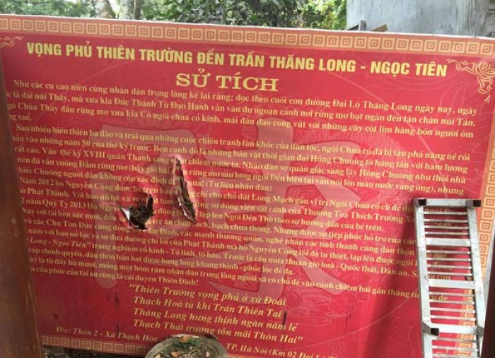 Khi chúng tôi tiếp cận tìm hiểu, ngay tại cổng biệt phủ của Vượng vẫn còn dựng một bức pa-nô lớn màu đỏ, in chữ vàng với những lời thuyết minh “nổ như sấm” về khu đất. Pa-nô viết (những chỗ bị rách đọc không rõ chúng tôi để dấu …-PV): “Vọng Phủ Thiên Trường đền Trần Thăng Long – Ngọc Tiên”. Sử tích: Như các cụ cao niên cùng nhân dân trong làng kể lại rằng: Dọc theo cuối con đường đại lộ Thăng Long ngày nay, ngày trước là dải núi Thầy mà xưa kia đức Thánh Từ Đạo Hạnh vẫn vân du ngoạn cảnh nơi rừng mơ bạt ngàn đến tận chân núi Tản. Gò Chùa Thầy đầu rừng mơ xưa kia có ngôi chùa cổ kính, mái đầu đao cong vút với những cây cột lim hàng bốn người ôm không xuể. Sau nhiều biến thiên ba đào và trải qua những cuộc chiến tranh tàn khốc của dân tộc, ngôi chùa cổ đã bị tàn phá nặng nề rồi mất hẳn vào những năm 50 của thế kỷ trước. Bên cạnh đó là những báu vật thời gian đại Hồng chuông to hàng tấn với hàm lượng vàng rất cao. Vào thế kỷ XVIII, quân Thanh sang xâm chiếm nước ta. Nhân dân sợ quân giặc lấy Hồng Chuông như thời nhà… nên đã vần xuống Đầm rừng mơ (bây giờ là bãi hoang rừng mơ sau lưng ngôi Đền hiện tại vẫn nổi lên màu nước vàng óng nhưng… chiếc chuông người dân không còn xác định được nữa! (tư liệu nhân dân).