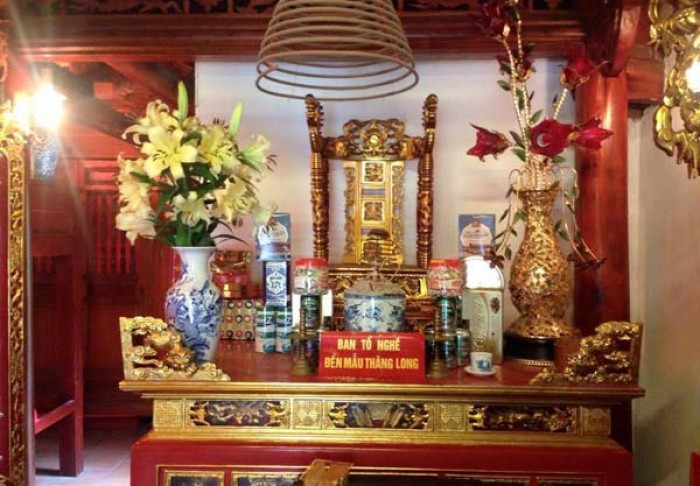 Đặc biệt, tiếp cận ngôi nhà gỗ phía trong, nơi được coi là phủ thờ các vị thánh, quy mô công trình và tính chất tín ngưỡng càng đậm đặc hơn. Phía trong ngôi nhà này còn có: Cung cấm tam vị thánh tổ; Ban tổ nghề đền mẫu Thăng Long; Ban sơn trang đền mẫu Thăng Long…và có nhiều bức tượng đồng, tượng gỗ. Khi phóng viên cho xem hình ảnh những bức tượng này, ông Mai Duy Hùng, Trưởng công an xã Thạch Hòa cho biết đó là các bức tượng Trần Hưng Đạo, Đức thánh Tản Viên Sơn…